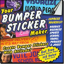 Create bumper stickers with attitude!Product InformationHad enough of other people's bumper stickers? Then it's time to make yourown! Promote your child your team your candidate your business - evenyour philosophy. In just five minutes you can be expressing yourselfeverywhere - on your car your room your guitar case or your backpack. With your Bumper Sticker Maker anyone can have an attitude. Product Features Packed with choices! Scores of ready to print bumper stickers 30 Fonts with attitude Add borders backgrounds and shapes Use your fonts or the ones provided Plus! 10000 graphics from Nova Development's Art Mania collectionWindows Requirements Windows 95 98 Me 2000 XP Pentium 90MHz processor minimum (or equivalent) 24MB or more available RAM CD-ROM DriveMacintosh Requirements Mac OS 8.5 to 9.x Power Macintosh 24MB or more available RAM CD-ROM Drive