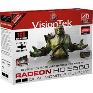 $76.88 Visiontek 900331 Radeon HD 5550 Graphic Card - 550 MHz Core - 1 GB DDR2 SDRAM - PCI Express 2.0 x16. RADEON HD 5550 PCIE 1GB DDR2 VGA/DVI/HDMI WIN7 300W V-CARD.